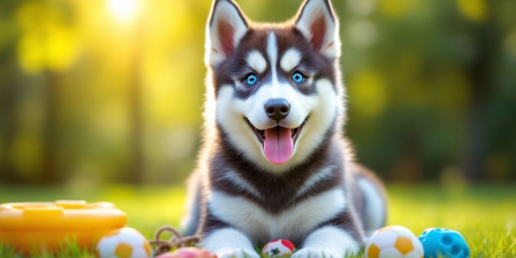 Husky puppy sitting on grass with dog toys.